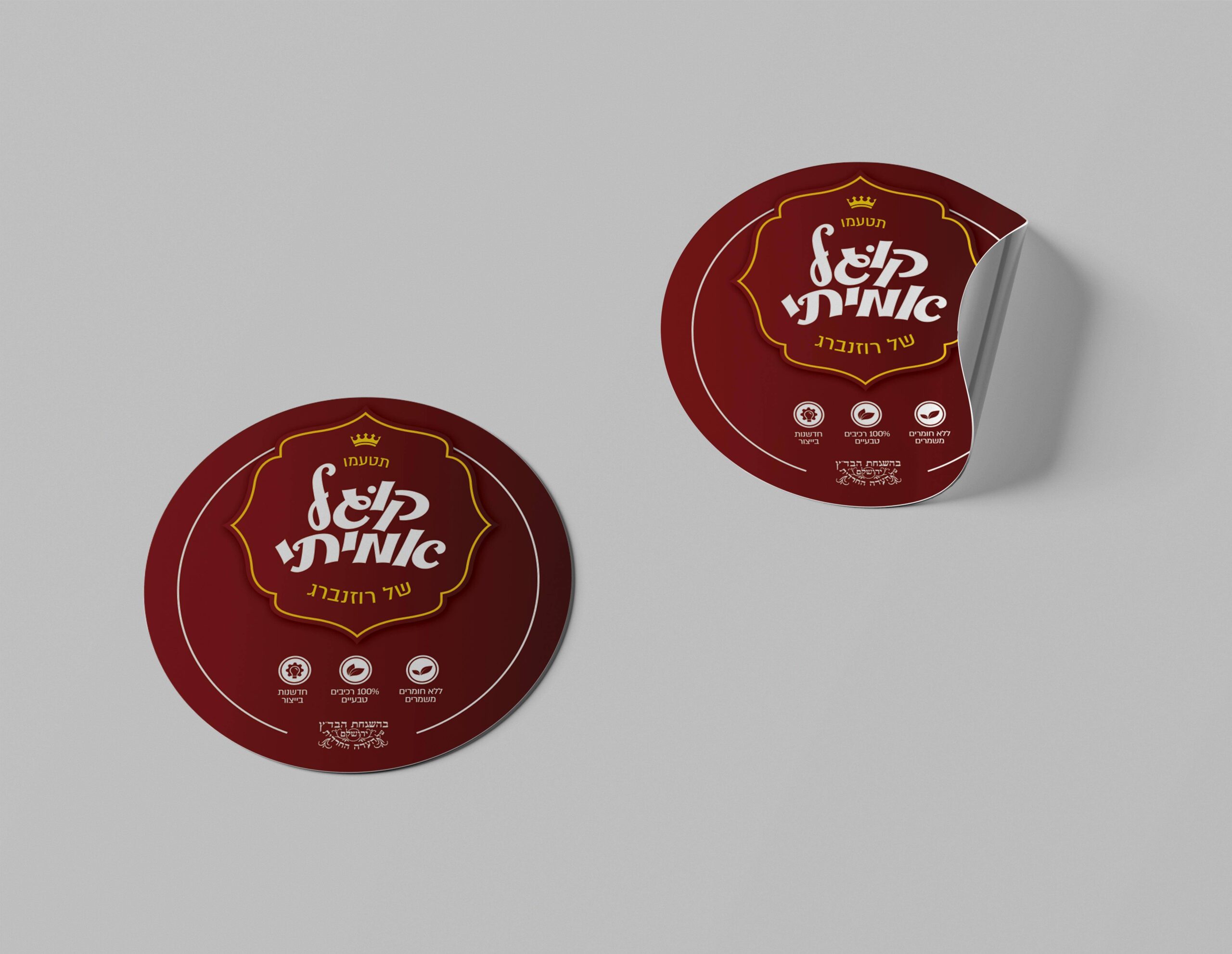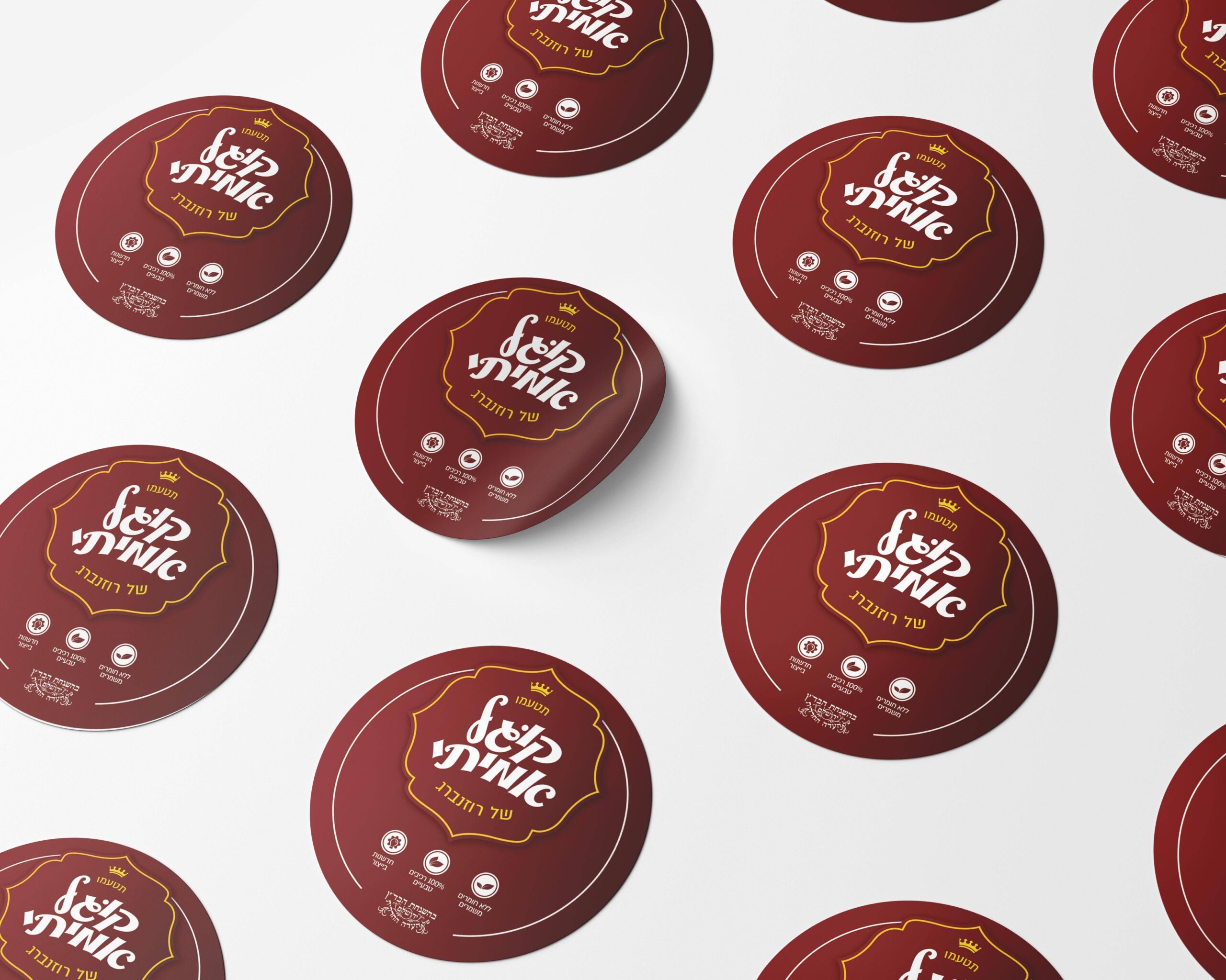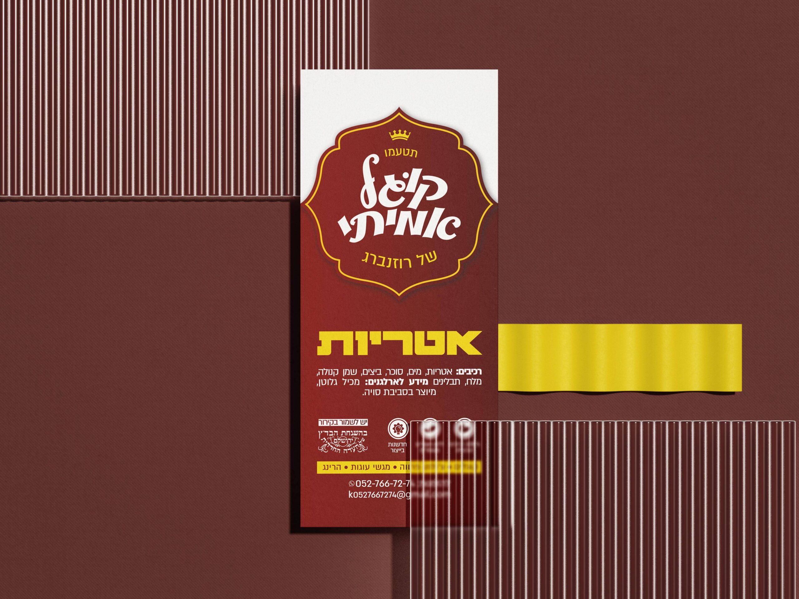הטמעת המיתוג והגדלת המכירות נשענות על שפה עיצובית המעוררת תיאבון ותחושת פרימיום מיידית. הבחירה בצבע בורדו עמוק משדרת מסורת, חמימות וביתיות, בעוד נגיעות הצהוב יוצרות קונטרסט גבוה שבולט על המדף ומושך את עין הצרכן בתוך שניות.